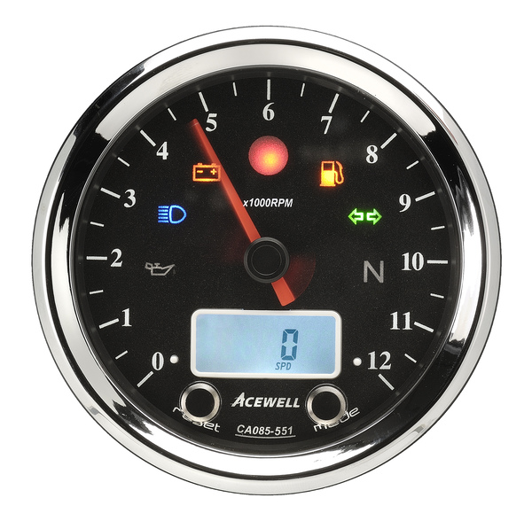 Tachometer with needle sweep, available in 2 ranges 9000rpm and 12000rpm