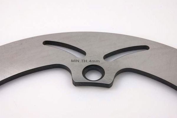 This front brake disc rotor is constructed from 420 stainless steel. The shape of the disc ensures good heat dissipation under heavy braking sessions, reducing brake fade, minimising warping, and ensuring brake disc longevity. The slotted disc ensures water and dirt are dispersed quickly when braking.