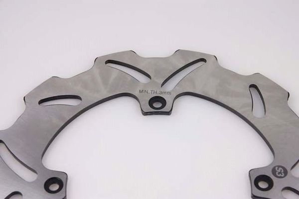 This front disc rotor is constructed from 420 stainless steel. The shape of the disc ensures good heat dissipation under heavy braking sessions, reducing brake fade, minimising warping, and ensuring rotor longevity. The slotted rotor ensures water and dirt are dispersed quickly when braking.