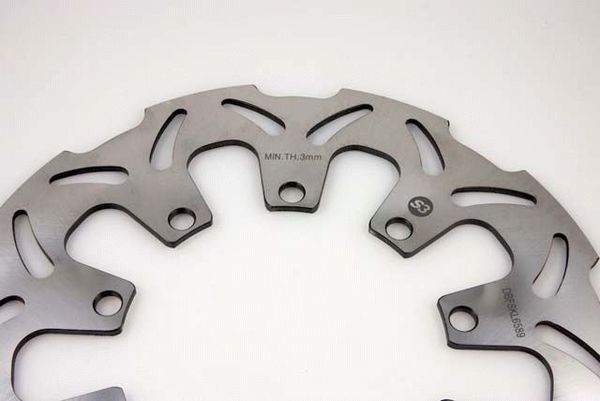 This front brake disc rotor is constructed from 420 stainless steel. The shape of the disc ensures good heat dissipation under heavy braking sessions, reducing brake fade, minimising warping, and ensuring brake disc longevity. The slotted disc ensures water and dirt are dispersed quickly when braking.