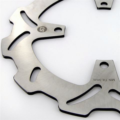 This front brake disc rotor is constructed from 420 stainless steel. The shape of the disc ensures good heat dissipation under heavy braking sessions, reducing brake fade, minimising warping, and ensuring brake disc longevity. The slotted disc ensures water and dirt are dispersed quickly when braking.