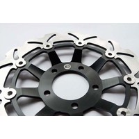 This front floating brake disc rotor is constructed from 420 stainless steel, with a 7075 Aluminium alloy centre hub for light weight. The shape of the disc ensures good heat dissipation under heavy braking sessions, reducing brake fade, minimising warping, and ensuring brake disc longevity. The slotted disc rotor ensures water and dirt are dispersed quickly when braking.
