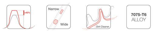 Increased tooth height improves chain retention while the bike is shivering and jolting