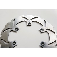 This rear brake disc rotor is constructed from 420 stainless steel. The shape of the disc ensures good heat dissipation under heavy braking sessions, reducing brake fade, minimising warping, and ensuring brake disc longevity. The slotted brake disc ensures water and dirt are dispersed quickly when braking.