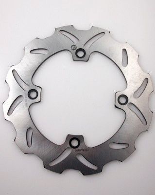 This rear brake disc rotor is constructed from 420 stainless steel. The shape of the disc ensures good heat dissipation under heavy braking sessions, reducing brake fade, minimising warping, and ensuring brake disc longevity. The slotted brake disc ensures water and dirt are dispersed quickly when braking.