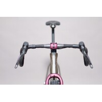 3D printed titanium headtube with zero stack colour matched titanium top cap.