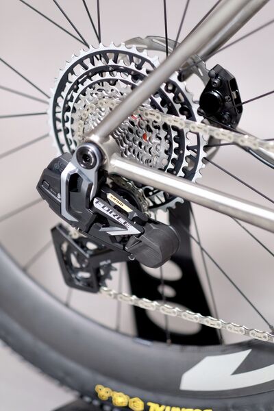 It is equipped with innovative components that provide an extraordinary riding experience. These features include 3D-printed headtube, top cap and rear dropouts, giving clean lines while still maintaining the beautiful aesthetic of a titanium frame. The T47 bottom bracket ensures you can pedal creak-free. The full internal frame cable routing makes for a stealthy look, and external cable routing under the stem and bars guarantees effortless maintenance and adjustment. Additionally, the UDH derailleur hanger offers versatility and future compatibility.