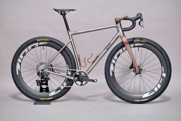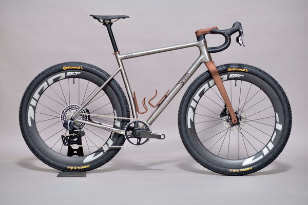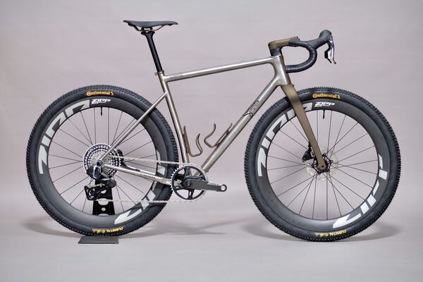 The frame is brushed titanium, while the fork, stem, and seatpost collar are coated in Cerakote (ceramic polymer) of the same colour - Cerakote ceramic coated titanium frame chassis for $5999.