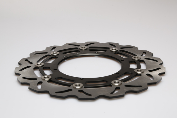 This front floating brake disc rotor is constructed from 420 stainless steel, with a 7075 Aluminium alloy centre hub for light weight. The shape of the disc ensures good heat dissipation under heavy braking sessions, reducing brake fade, minimising warping, and ensuring brake disc longevity. The slotted disc rotor ensures water and dirt are dispersed quickly when braking.
